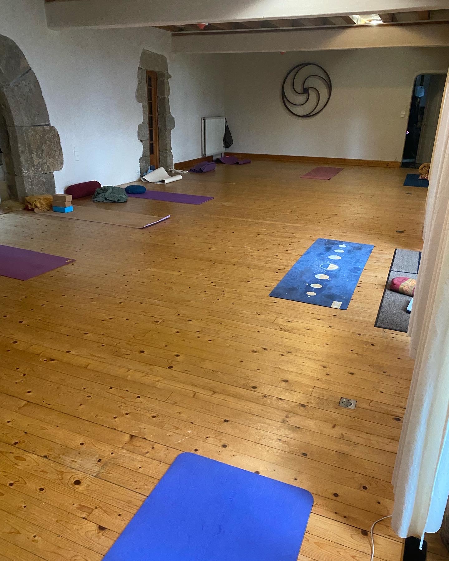 Nous pratiquons dans une belle salle en parquet avec vue sur la Ria d’Etel.